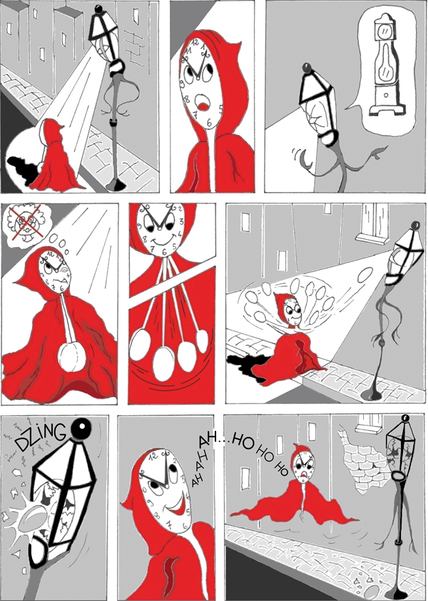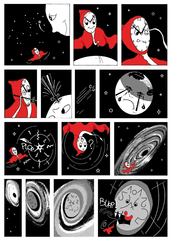 Il fait totalement nuit maintenant. Le Temps se prépare. Il met ses bottes tissées de vents, règle ses aiguilles, se drape dans sa grande cape rouge. Comme tous les soirs, il doit attendre le sommeil des villageois pour faire passer la nuit. Presque tout le village est endormi, à présent, les derniers humains se couchent. Il est temps.